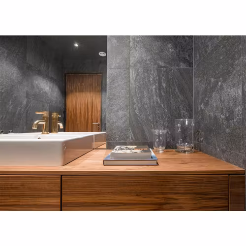 D Quartzit Black är en granitkeramik inspirerad av skärgårdsklippors variation och skiftningar i struktur och mönster. Ytan är levande med mycket naturtrogen känsla.