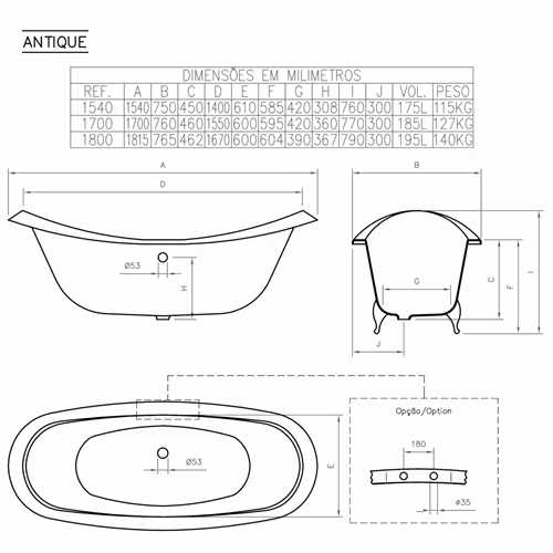 Med tre generösa storlekar – 154, 170 och 180 cm – anpassar sig Antique efter både mindre och mer rymliga miljöer. Lejonfötterna erbjuds i krom, vit emalj eller mässingsplättering för att harmoniera perfekt med din inredning. Diskreta justerskruvar möjliggör finjustering upp till 10 mm, vilket säkerställer perfekt balans och stabilitet.
