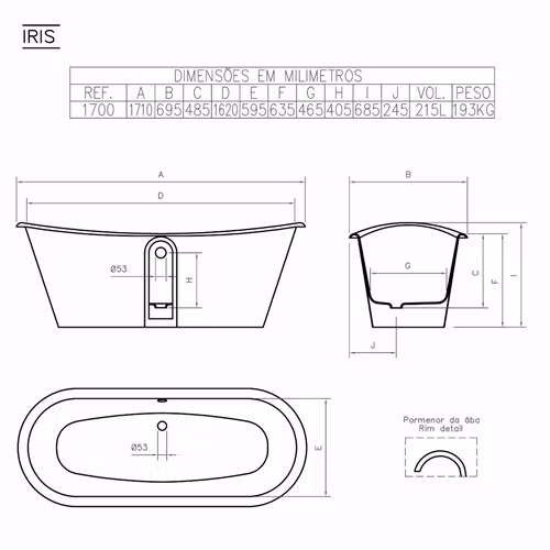 Iris fristående badkar är ett elegant gjutjärnsbadkar med äkta porslinsemalj, integrerat i en dekorativ ställning. Med en längd på cirka 170 cm kombinerar badkaret klassisk form med modern funktion och skapar en exklusiv känsla i badrummet.