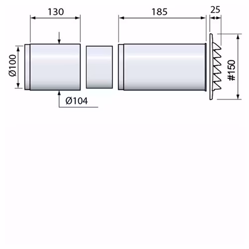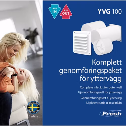 Komplett genomföringspaket för yttervägg, innehåller kallrasskydd, ytterväggsgaller #150 samt modulrör Ø100/104 mm. För anslutning till fläktar med stos Ø98-100 mm. Passar väggtjocklek upp till 310 mm, vid tjockare vägg komplettera med extra modulrör.