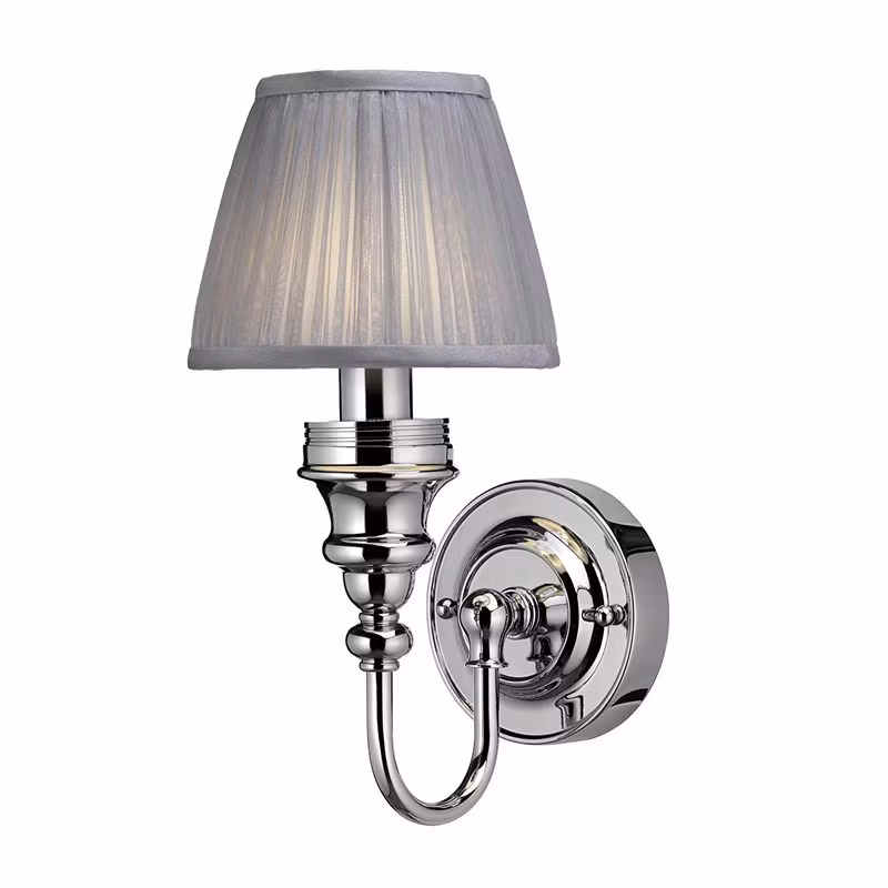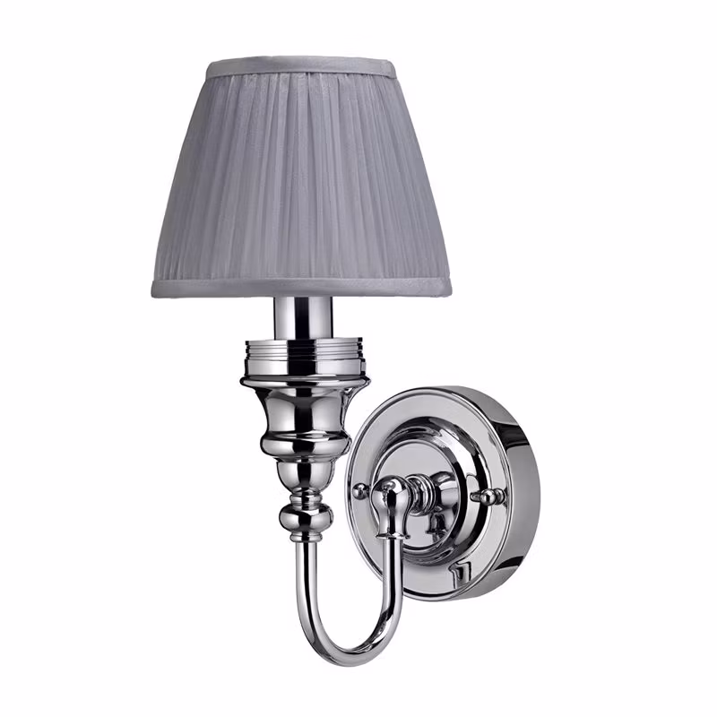 Burlington badrumslampa BUR-ELBL25, krom och silvrig veckad tygskärm. Lampan är IP44-klassad och CE-märkt vilket gör den godkänd för montage i badrum i alla europeiska länder. Lampan är inte vändbar utan ska monteras som på bilderna.
