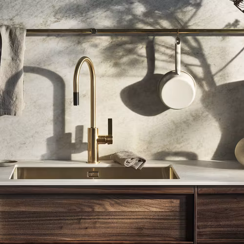 Köksblandare med svängbar pip och utdragbart munstycke. Pipens svängradie går att begränsa till mellan 60 och 270 grader med 15 graders intervaller.