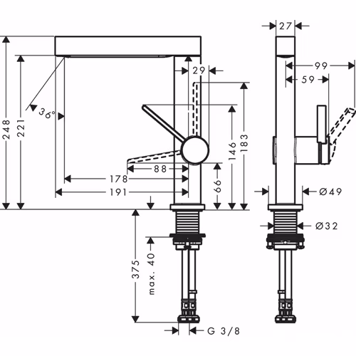 - strålen ändras med knapptryckning och återställs automatisk genom att stänga blandaren