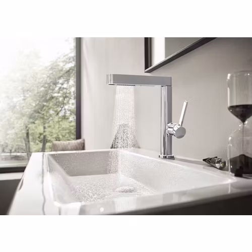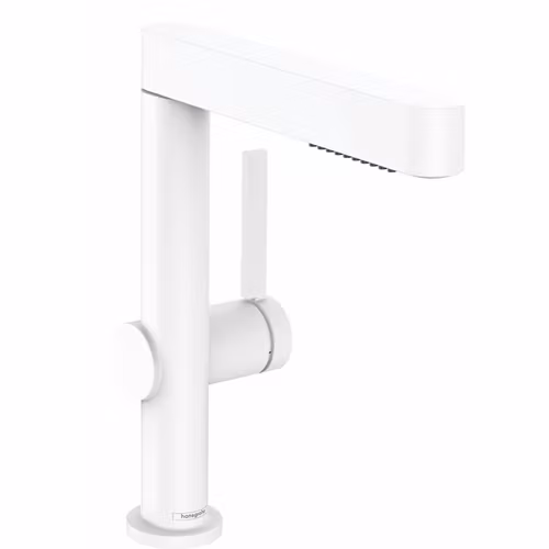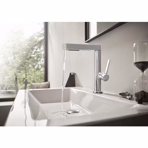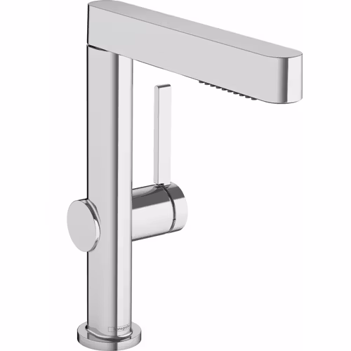 Engreppsblandaren Finoris 230 med utdragbar spray från hansgrohe imponerar med sin tunna, geometriska design och många komfortfunktioner.