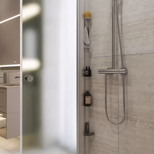 Med en enkel och elegant duschhylla med 5 flyttbara hyllplan, som håller ordning på schampo, tvål och allt du behöver i badrummet.
