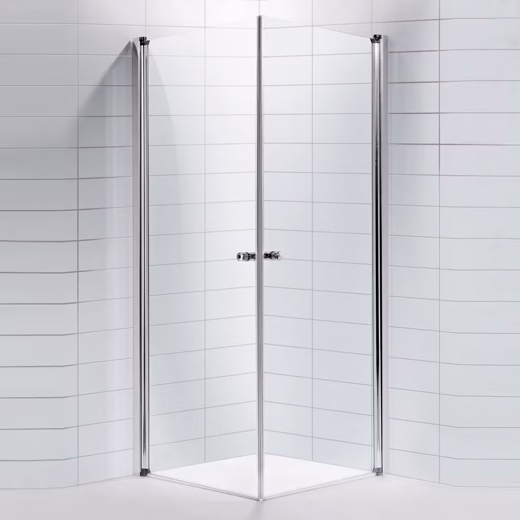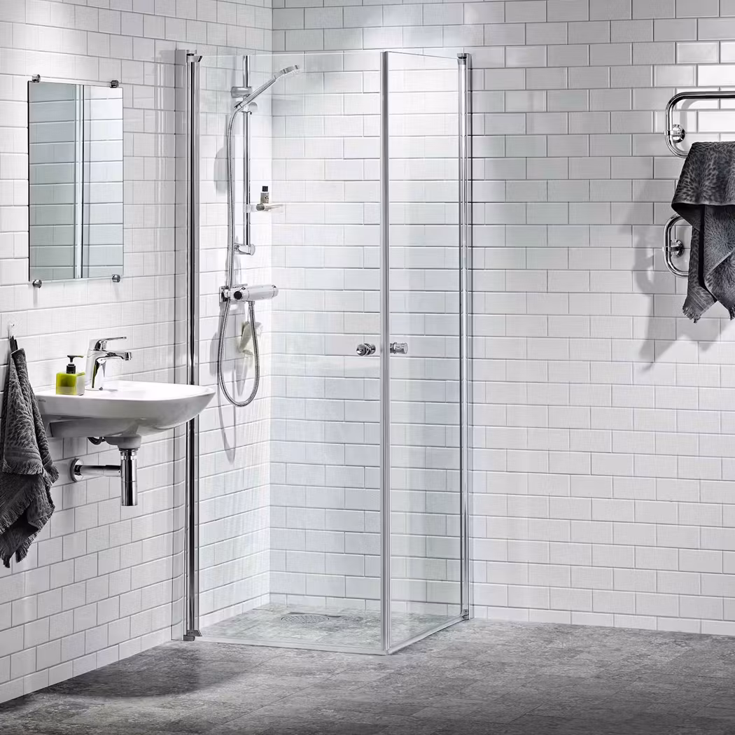 Solo Duschhörnor. Raka dörrar i 6 mm klart härdat säkerhetsglas och förkromade aluminiumprofiler. Justerbarhet (+-7,5) mm/dörr. Höjd 1 950 mm.