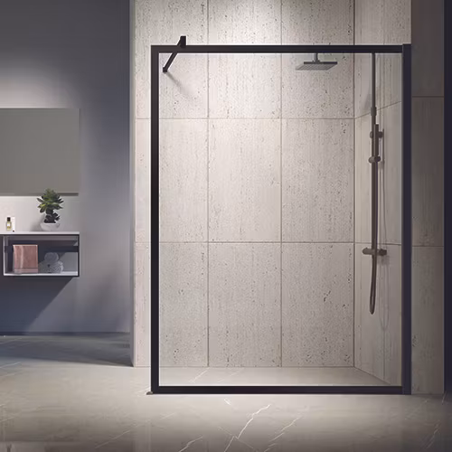 Kuadra Frame duschvägg kan monteras både i vänster- och höger vägg. Transparent 8 mm glascrystal clear klarglas med printad ram runt.