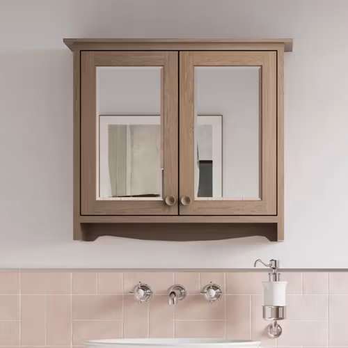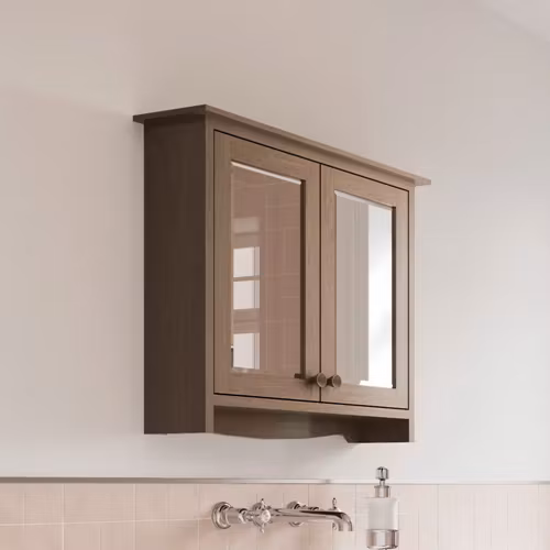 Stilrent väggskåp från Guild med integrerade spegeldörrar, ca 65 × 57 cm – en perfekt kombination av förvaring och funktion för badrummet. Skåpet finns i fem eleganta färger: Dark Oak, Light Oak, Ashbee Grey, Carlyle Green och Varley White, vilket gör det enkelt att matcha med övrig inredning.