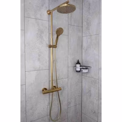 Infigo L 150CC guld takduschpaket i elegant dansk design passar in i alla badrumsmiljöer. Duschsetet har en 20 cm stor takdusch och en 1-strålig handdusch som är monterad på på en elegant duschstång med justerbart väggfäste. ADORA handdusch och takdusch har Easy Clean System som säkerställer att det går lätt att avlägsna eventuellt kalk från duschmunstyckena. ADORA Infigo termostat har en eco-stoppfunktion som gör att du håller nere din vattenförbrukning. Det finns dessutom ett smart skållningsskydd så att du undviker olyckor. Det finns också ett skydd mot kallvattenstopp integrerat i termostatblandaren. Det medföljer stilfullt designade täckbrickor till termostaten, plugg, skruv och en utförlig manual som gör monteringen av takduschpaketet enkel. Detta duschset finns också i svart, blankkrom, borstad guld och borstad roséguld. 10 års garanti mot dropp- och tillverkningsfel.