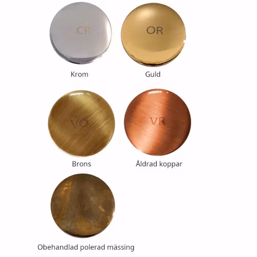 Produkten finns i flera ytbehandlingar, inklusive krom, guld, brons (åldrad mässing), åldrad koppar samt obehandlad polerad mässing som med tiden utvecklar en naturlig patina och kan poleras upp vid behov.