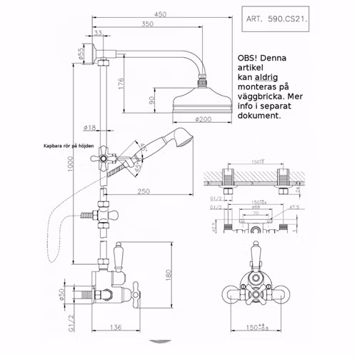 Det går att komplettera duschsetet med ett 75 cm långt nedre rör (det rör som sitter precis ovanför blandaren) ifall man vill få upp taksilen högre. Detta rör går att kapa till önskad längd.