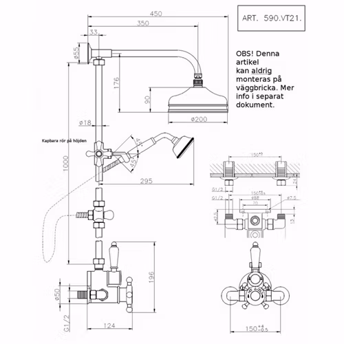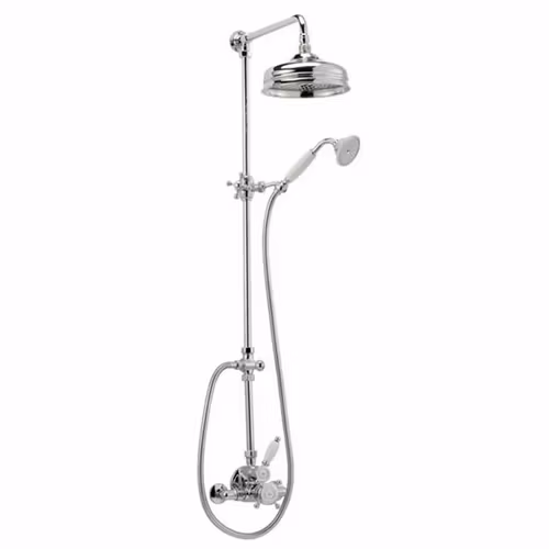 Victorian 592 är ett komplett badkars- och duschset som kombinerar klassisk design med moderna funktioner. Setet är utrustat med en termostatblandare och en generös taksil på 20 cm som ger en behaglig duschupplevelse. För ökad flexibilitet ingår även en handdusch med hållare som monteras på det uppåtgående röret.