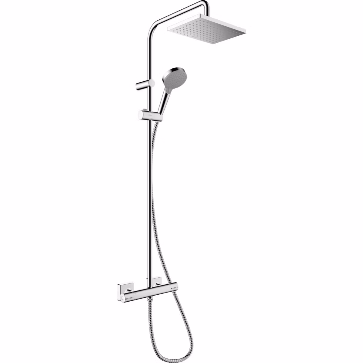 Handduschen har ett höj- och sänkbart reglage med en låsande tryckknapp, vilket gör det enkelt att hitta den perfekta positionen för dig och hålla den på plats. Plus, den exponerade designen med alla fungerande delar utanför väggen gör installationen snabb och enkel. Den termostatiska designen håller vattnet vid en jämn temperatur, medan QuickClean-tekniken gör rengöringen av duschmunstyckena till en lek, kräver bara en avtorkning med fingrarna för att rensa bort skräp, kalk eller smuts. Med alla dessa fantastiska funktioner kommer hansgrohe Vernis Shape Showerpipe 230 1jet med termostat garanterat att ge dig många års njutning.
