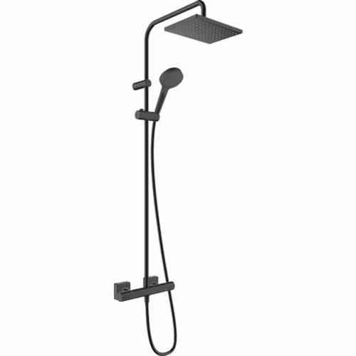Hansgrohe Vernis Shape Showerpipe 230 1jet med termostat har en kromad eller mattsvart finish och är en elegant och stilren takdusch till alla badrum. Detta set innehåller en takdusch, en handdusch, en termostatisk duschblandare, en duschslang och ett reglage, vilket ger allt du behöver för den perfekta duschupplevelsen. Takduschen har hansgrohes regnspraytyp för en avkopplande upplevelse, medan handduschen erbjuder både Rain- och IntenseRain-spraytyper när du behöver lite mer kraft. Takduschen är också justerbar, så att du kan hitta den perfekta vinkeln för dina behov.
