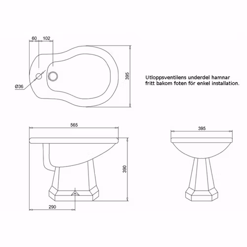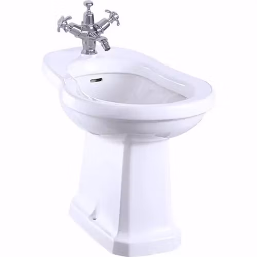 Burlington bidé i klassisk design med ett blandarhål – smart konstruktion där avloppsventilen placeras bakom foten för enkel och smidig installation.