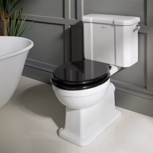 Victrion gammaldags toalett med spolvred på sidan. Toaletten har modern spolfunktion med hel och halvspolning. Vid halvspolning vrids vredet uppåt och vid helspolning nedåt. Spolmängderna är justerbara.