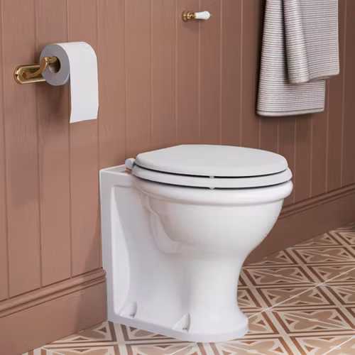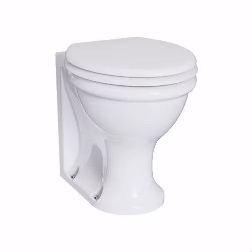 Guild back to wall toalett i klassisk utformning. Toaletten säljs komplett med mjukstängande sits i valfri färg.