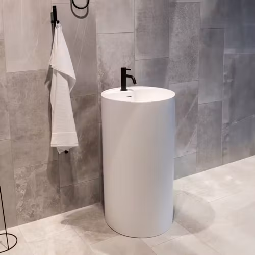 Ett mattvitt fristående tvättställ i kompositmaterialet Solid Surface. 1 hål för blandare. Bräddavlopp och bottenventil i samma matt vita färg som tvättstället ingår i priset.