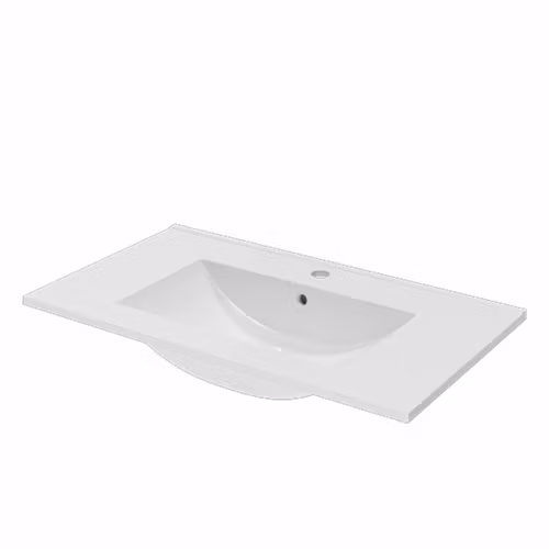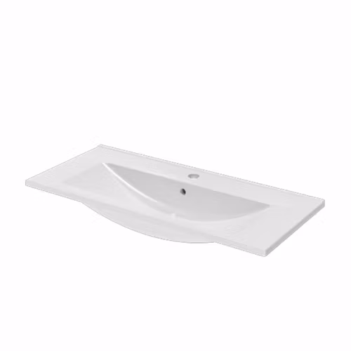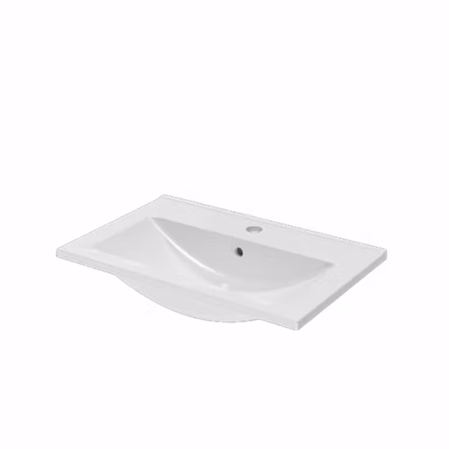 Tunt porslinstvättställ med rektangulär ho och överfyllnadsskydd.