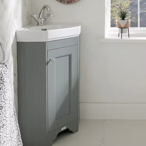 Platsbesparande och stilren hörnkommod från Bayswater – perfekt för mindre badrum eller för att maximera utrymmet i ett hörn. Den klassiska designen kombineras med praktisk funktion och noggrant utvalda material.