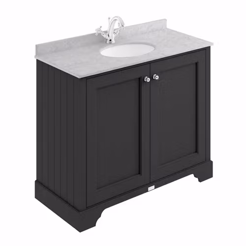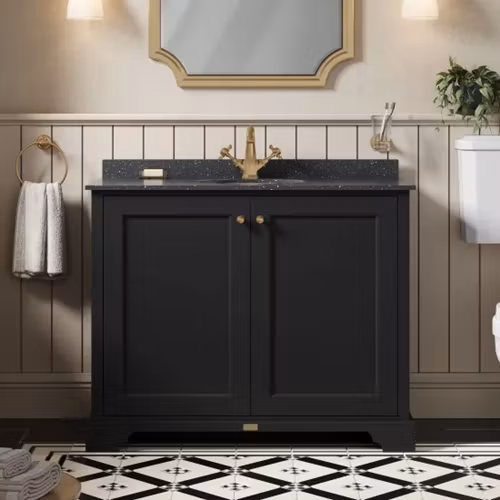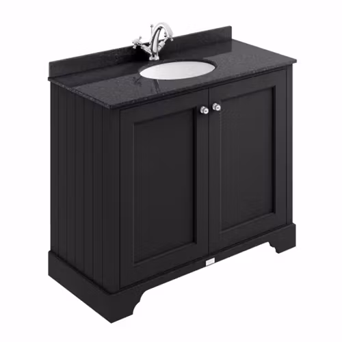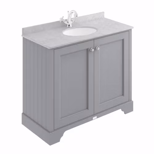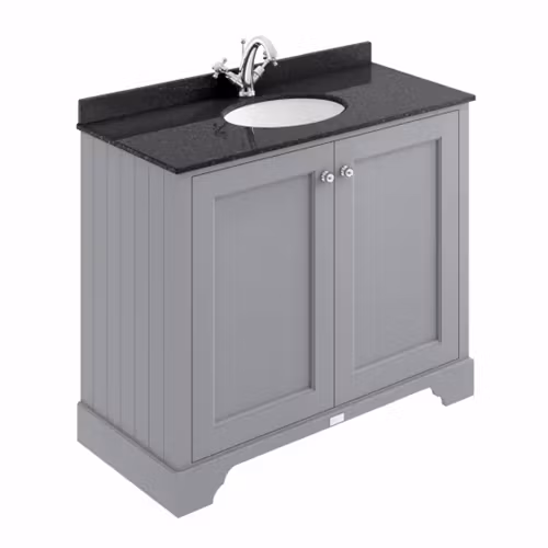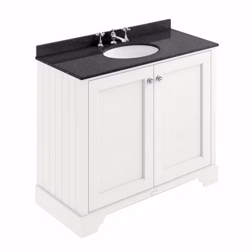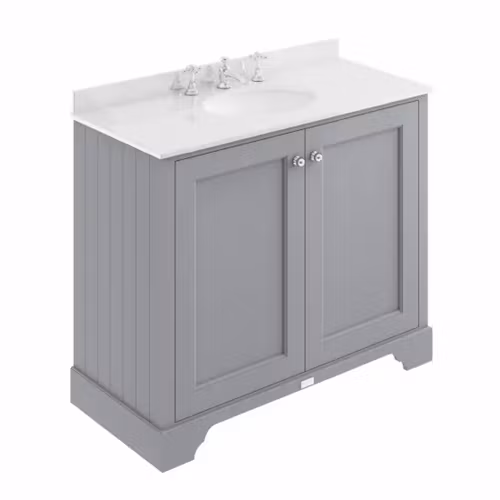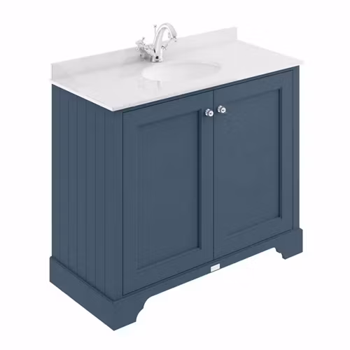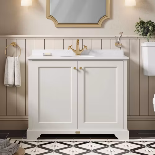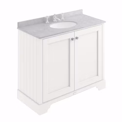 Elegant badrumskommod från Bayswater, ca 102 cm bred, som kombinerar klassisk design med exklusiva material. Kommoden finns i flera stilfulla färger såsom Pointing White (bruten vit), Plummett Grey, Stiffkey Blue och matt svart – perfekt för att skapa ett personligt badrum.