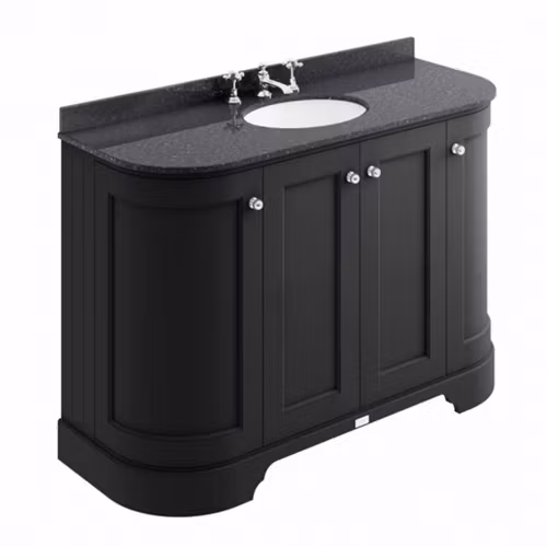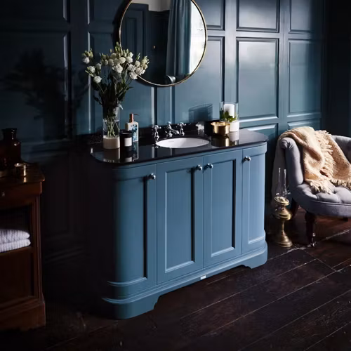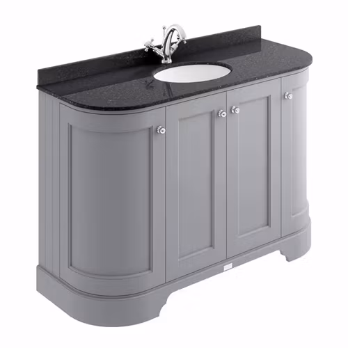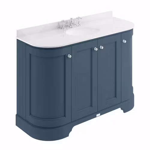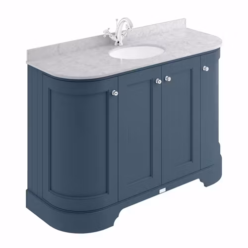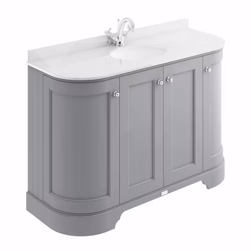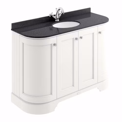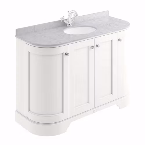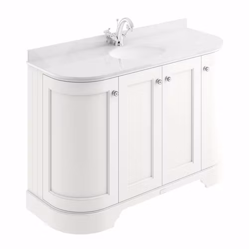 Elegant rundad badrumskommod från Bayswater, ca 122 cm bred, som kombinerar mjuka former med klassisk design och exklusiva materialval. Perfekt för dig som vill skapa ett stilfullt och harmoniskt badrum.