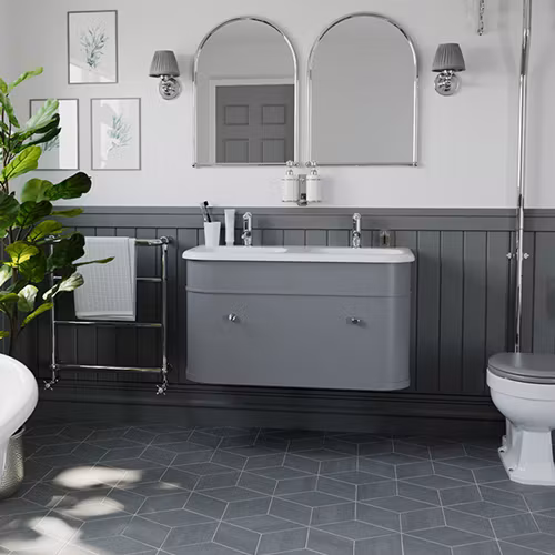 Elegant rundad badrumskommod ur Chalfont-serien med tydlig Art Deco-inspiration, 100 cm bred. Den stilrena designen med mjuka former och utdragbar låda gör den till ett perfekt val för både moderna och klassiska badrum.