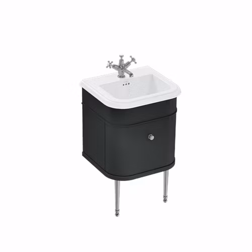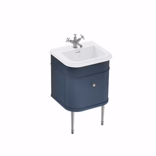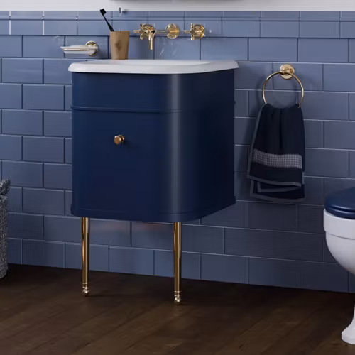 Elegant rundad badrumskommod ur Chalfont-serien med tydlig Art Deco-inspiration, 55 cm bred. Den stilrena designen med mjuka former och utdragbar låda gör den till ett perfekt val för både moderna och klassiska badrum.