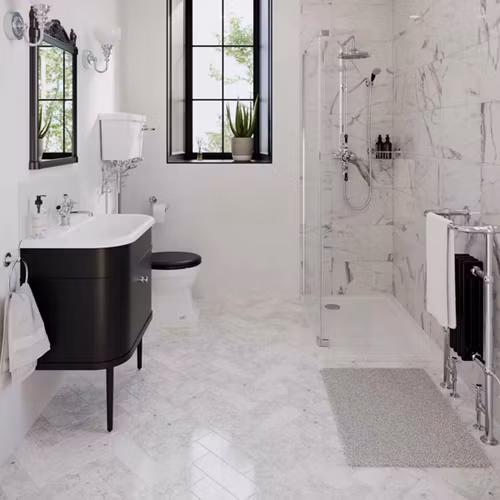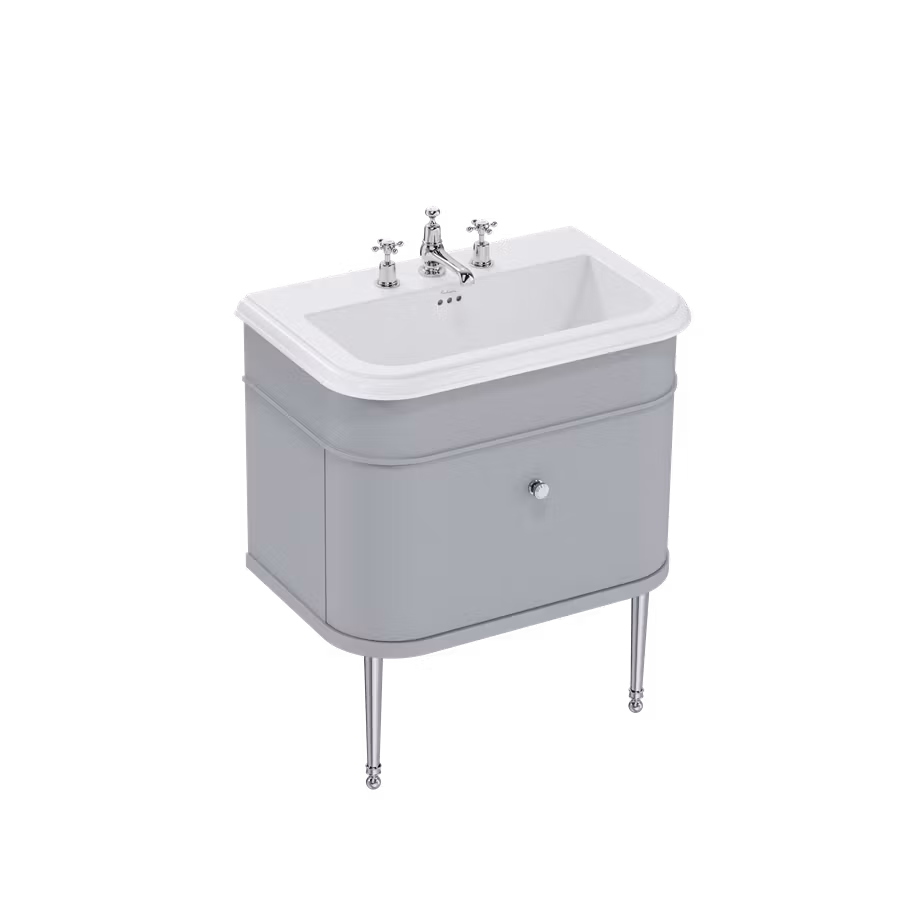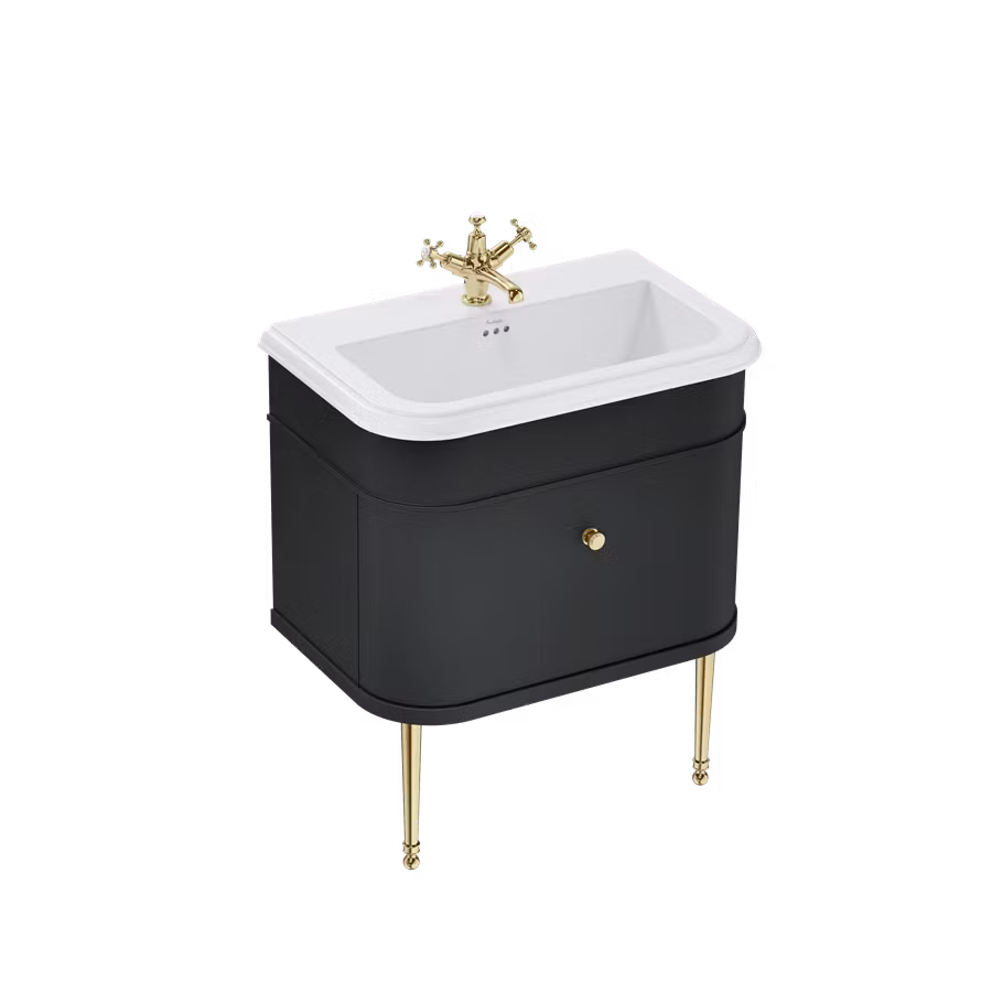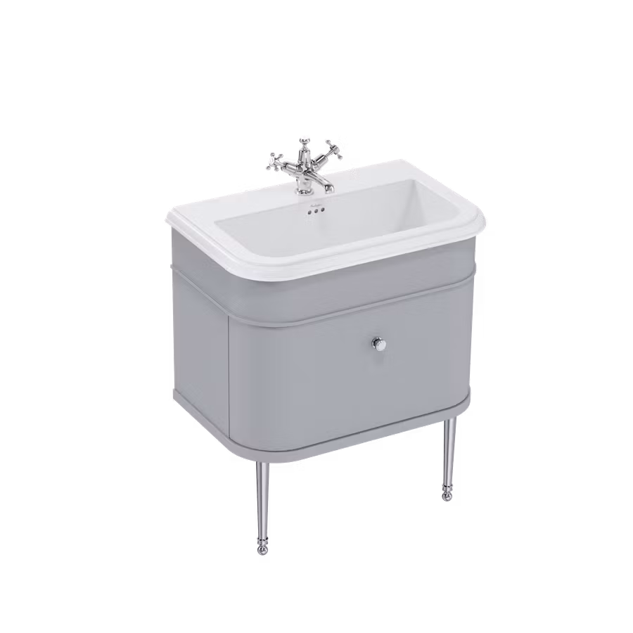Elegant rundad badrumskommod ur Chalfont-serien med tydlig Art Deco-inspiration, 75 cm bred. Den stilrena designen med mjuka former och utdragbar låda gör den till ett perfekt val för både moderna och klassiska badrum.