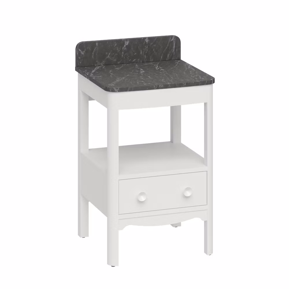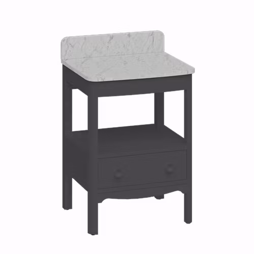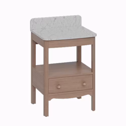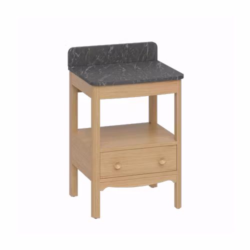 Toppen finns att beställa i Dark Oak, Light Oak, Carrara-minerva och Marquina-minerva. Minerva är ett kompositmaterial som är extra tåligt och kan bearbetas för att passa det aktuella badrummet. Alla skivor kommer utan uttag och anpassas av installatören med vanliga verktyg för träbearbetning. Minervaskivorna kommer tillsammans med ett stänkskydd i bakkant (höjd ca 11,5 cm). Stänkskyddet behöver inte användas om man inte gillar detta. Ektopparna kommer utan stänkskydd. Alla topparna är ca 20 mm tjocka. Tvättstället ovanpå måste inte användas utan det går att göra egna lösningar med kommod och topp.