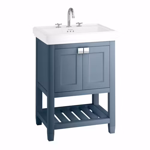 Kommoden finns i tre eleganta färger: matt blå, matt svart och matt vit. Den kombineras med ett porslinstvättställ som finns med ett eller tre hål för blandare. Handtag levereras i krom som standard, med möjlighet att välja till guldfärg för en mer exklusiv känsla.