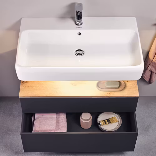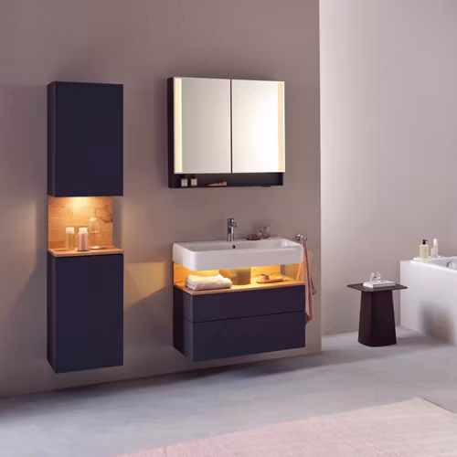 - Inbyggd Nischbelysning: Det unika belysningssystemet, fabriksmonterat i nischen mellan tvättstället och möbeln, skapar en stämningsfull atmosfär. Den energisnåla och långlivade LED-belysningen har en ljustemperatur på 3500 K och kan enkelt styras via en väggströmbrytare.