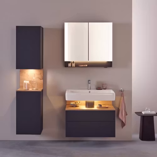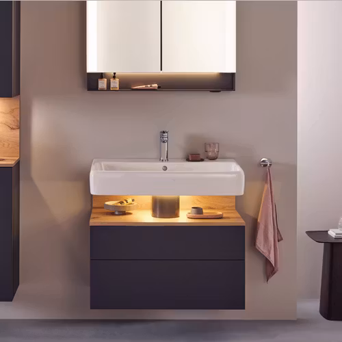 - Inbyggd Nischbelysning: Det unika belysningssystemet, fabriksmonterat i nischen mellan tvättstället och möbeln, skapar en stämningsfull atmosfär. Den energisnåla och långlivade LED-belysningen har en ljustemperatur på 3500 K och kan enkelt styras via en väggströmbrytare.