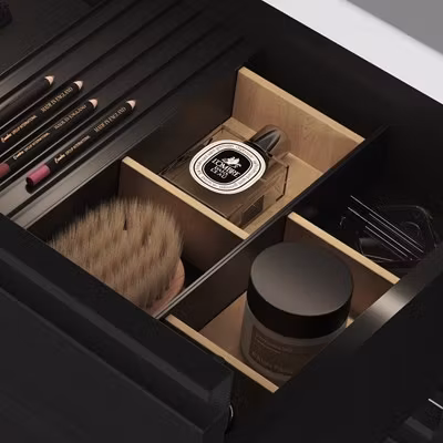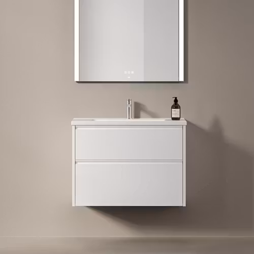 Kommod i färgen Premium White med två lådor, grepplist och tvättställ i porslin.