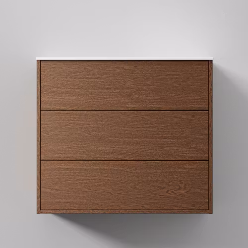 Terra Solid 80 är kommoden för dig som söker en solitär som tar plats, både fysiskt och visuellt. Med sin släta front och höga stomme på 70 cm kombinerar den stilren design med mer av allt, mer förvaring, mer karaktär och mer materialkänsla. Kommoden finns i ett fanér med större mönster än övriga serier, ett fanér som skapar djup och rörelse i uttrycket och gör möbeln till ett statement i rummet. För ett mer nedtonat intryck finns Terra Solid även i Pure White eller i valfri NCS-kulör, perfekt för dig som vill anpassa färgen efter ditt eget badrum. Med tre rymliga, fullt utdragbara lådor erbjuder kommoden en förvaringskapacitet som annars är reserverad för betydligt större möbler. Samtliga ytor är behandlade med TX Top Extreme™, vilket garanterar motståndskraft mot fukt och slitage i minst 15 år.