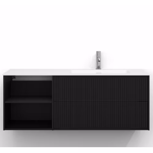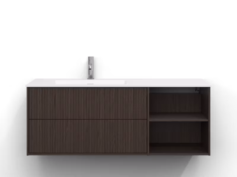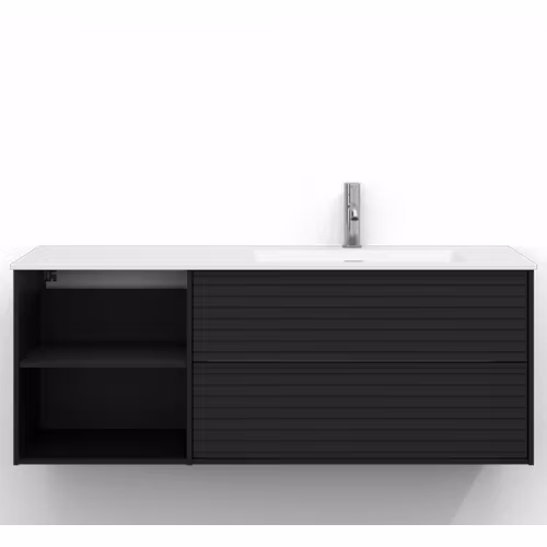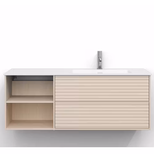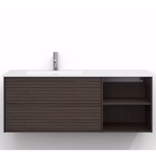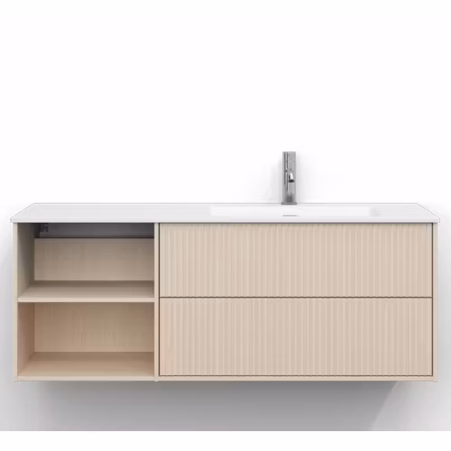 Skåpet är utrustat med EasyMount, Svedbergs patenterade upphängningssystem, som ger en snabb, enkel och säker montering på väggen. Den mjukstängande lådan har fullutdrag, vilket gör innehållet lättillgängligt, medan den öppna förvaringen ger både funktion och ett luftigt uttryck.