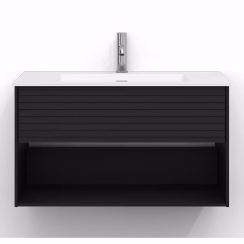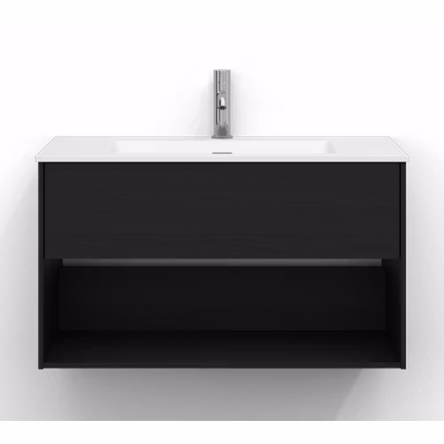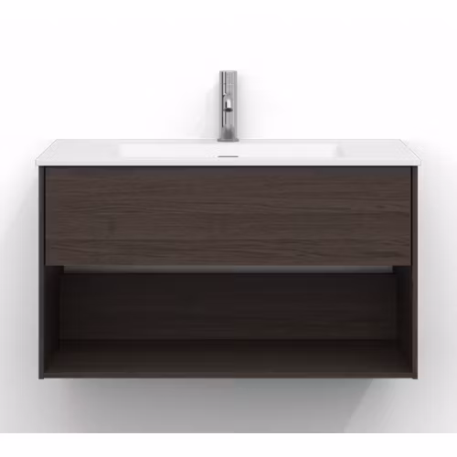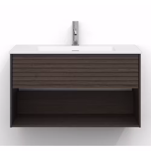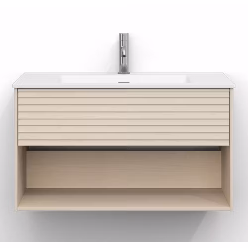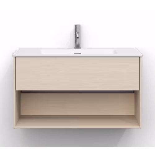 Skåpet är utrustat med EasyMount, Svedbergs patenterade upphängningssystem, som ger en snabb, enkel och säker montering på väggen. Den mjukstängande lådan har fullutdrag, vilket gör innehållet lättillgängligt, medan den öppna förvaringen ger både funktion och ett luftigt uttryck.