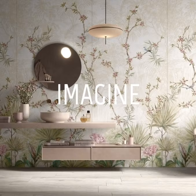 Granitkeramik Imagine är en serie som kombinerar olika stilar, från naturlig till retro, med tapeteffekt. Designen ger nya möjligheter att skapa färgrika miljöer.