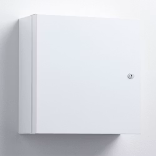 Barnsäkert medicinskåp med två hyllor för förvaring. Fack-I kan hängas på vänster eller höger sida och medicinskåpet leveras med två nycklar.