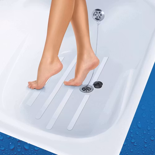 Halkskydd för dusch och badkar. 6 st transparenta remsor á 25x2,5 cm som fästes på ren och fettfri yta.