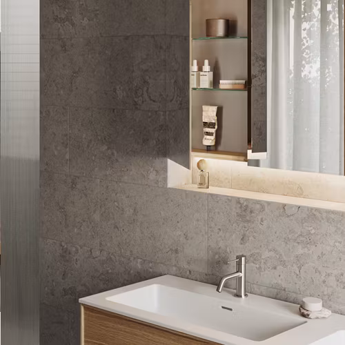 Två världar av sten, formade av is, vind och väntan. Sprungna ur samma nordiska natur men med olika temperament – den ena rå och uttrycksfull, den andra stilla och harmonisk. Alvaret och Stenvide är granitkeramiska tolkningar av nordisk kalksten. Här möts naturstenens utseende och känsla med granitkeramikens tålighet i uttryck skapade för badrum som ska hålla över tid.