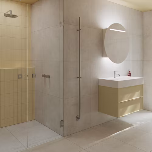 Stenvide Drift är en ljusgrå klinker i granitkeramik med inspiration från gotländsk kalksten. Den glaserade, lätt strukturerade, halvmatta ytan tillsammans med den balanserade, svala färgskalan med varm underton skapar en harmonisk rytm i badrummet. Tillsammans låter de andra material komma till sin rätt – utan att själva ta över. Den finstämda texturen ger ett mjukt men levande uttryck som fungerar lika väl på vägg som på golv. Drift ingår i klinkerserien Stenvide, en serie som finns i flera format för en enhetlig känsla i både små och stora badrum. Tack vare de exakt kapade kanterna kan Stenvide läggas med en mycket smal fog – ned till 2 mm – vilket ger ett rent, modernt uttryck där ytan upplevs nästintill sömlös.