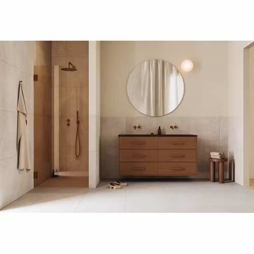 Stenvide Hay är en ljus beigefärgad klinker i granitkeramik med inspiration från gotländsk kalksten. Med sitt nedtonade, varsamma mönster rör sig Stenvide stilla genom badrummet och låter andra material ta plats. Serien finns i fyra kulörer och fem storlekar, med mönstervariationer som tillsammans skapar ett naturligt och levande uttryck. Klinkern är glaserad, halvmatt och lätt strukturerad, vilket ger både ett harmoniskt uttryck och en skön känsla under fötterna. Plattorna har exakt kapade kanter och kan läggas med en fog på ned till 2 mm för ett enhetligt intryck. Granitkeramik är tåligt, lättskött och hållbart och fungerar utmärkt med golvvärme. Det ger dig stor frihet att skapa rätt stämning i badrummet.