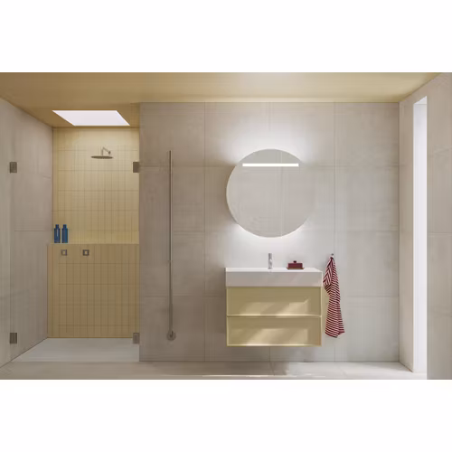 Stenvide Drift är en ljusgrå klinker i granitkeramik med inspiration från gotländsk kalksten. Den glaserade, lätt strukturerade, halvmatta ytan tillsammans med den balanserade, svala färgskalan med varm underton skapar en harmonisk rytm i badrummet. Tillsammans låter de andra material komma till sin rätt – utan att själva ta över. Den finstämda texturen ger ett mjukt men levande uttryck som fungerar lika väl på vägg som på golv. Drift ingår i klinkerserien Stenvide, en serie som finns i flera format för en enhetlig känsla i både små och stora badrum. Tack vare de exakt kapade kanterna kan Stenvide läggas med en mycket smal fog – ned till 2 mm – vilket ger ett rent, modernt uttryck där ytan upplevs nästintill sömlös.