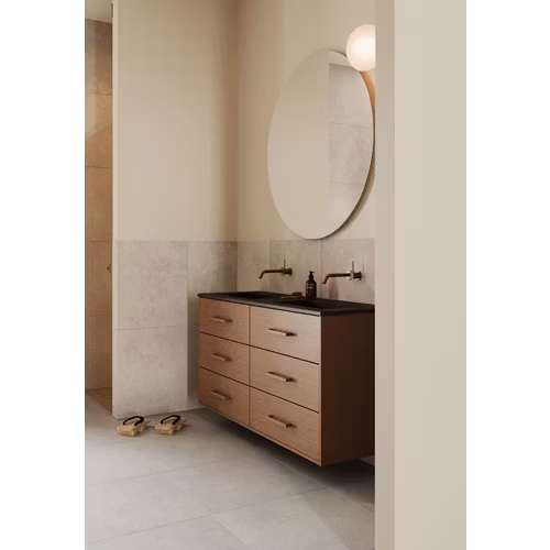 Stenvide Hay är en ljus beigefärgad klinker i granitkeramik med inspiration från gotländsk kalksten. Med sitt nedtonade, varsamma mönster rör sig Stenvide stilla genom badrummet och låter andra material ta plats. Serien finns i fyra kulörer och fem storlekar, med mönstervariationer som tillsammans skapar ett naturligt och levande uttryck. Klinkern är glaserad, halvmatt och lätt strukturerad, vilket ger både ett harmoniskt uttryck och en skön känsla under fötterna. Plattorna har exakt kapade kanter och kan läggas med en fog på ned till 2 mm för ett enhetligt intryck. Granitkeramik är tåligt, lättskött och hållbart och fungerar utmärkt med golvvärme. Det ger dig stor frihet att skapa rätt stämning i badrummet.