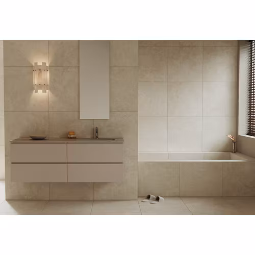 Stenvide Linen har en mjuk, ljusbeige ton där det subtila kalkstensinspirerade mönstret skapar en känsla av lugn och rymd. Här får andra material och former stå i centrum – samtidigt som granitkeramiken knyter ihop helheten med ett sobert, naturligt uttryck. Stenvide är en glaserad halvmatt klinker i granitkeramik som tål golvvärme och som finns i flera kulörer och storlekar – perfekt för dig som vill skapa en genomtänkt och personlig helhet i badrummet. Stenvide Linen har rakt kapade kanter, vilket möjliggör läggning med smal fog – ned till 2 mm – för ett harmoniskt och enhetligt resultat.