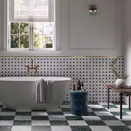 Royal är en granitkeramik med ett klassiskt och elegant marmorutseende som ger rummet en tidlös och exklusiv känsla. Verde Alpi är en grön granitkeramik med exklusiv marmorlook och ljusa ådringar – perfekt för ett elegant och tidlöst intryck.