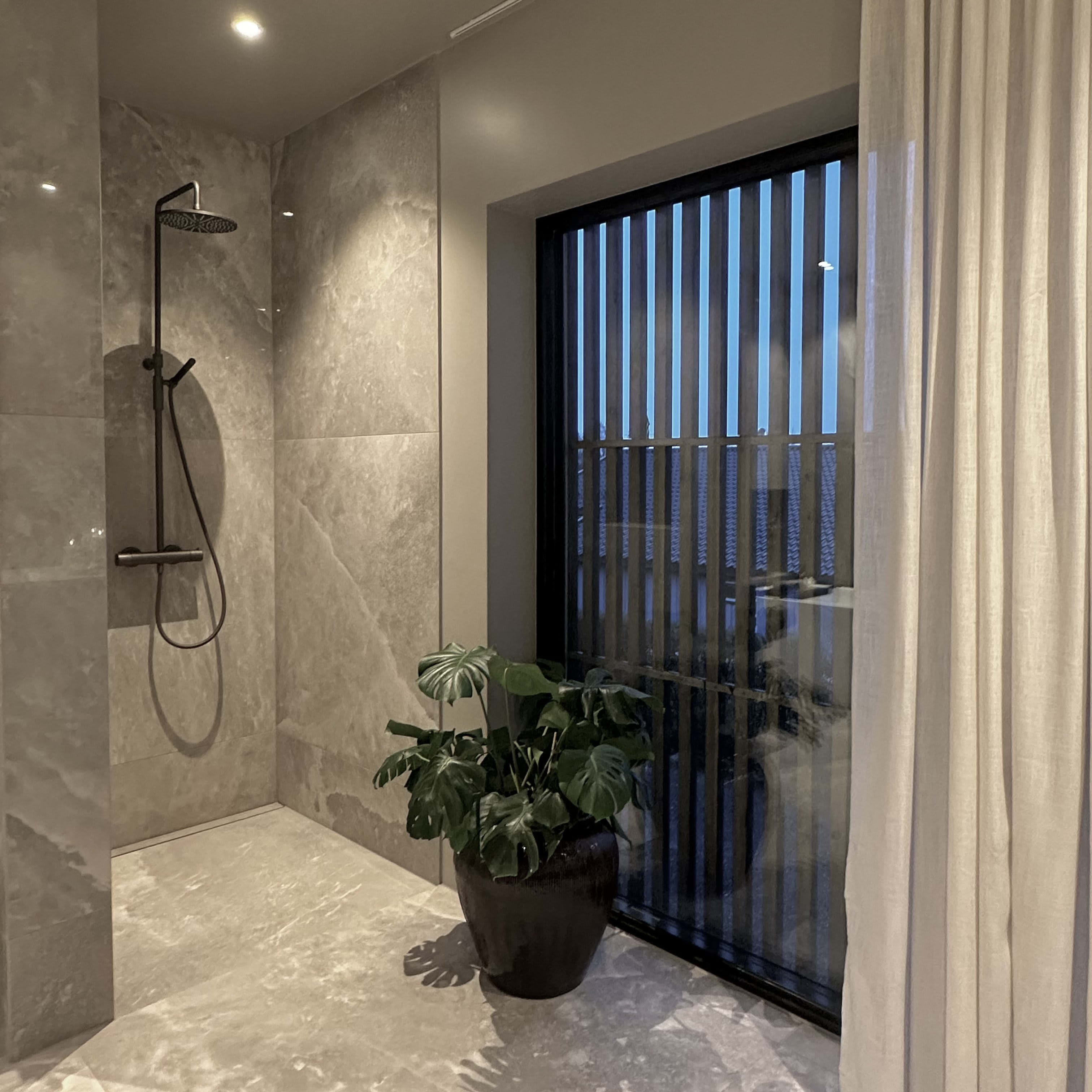 Vad gäller kakel på väggarna så valde jag medvetet polerade klinker för att skapa en kontrast mot den matta putsen i taket och på ena väggen där badrumsmöblerna hänger. Den polerade ytan ger en känsla av exklusivitet samtidigt som den bryter mot mattans dämpade uttryck. Detta val ger rummet en extra dimension och ger ett visuellt tilltal som jag verkligen uppskattar.