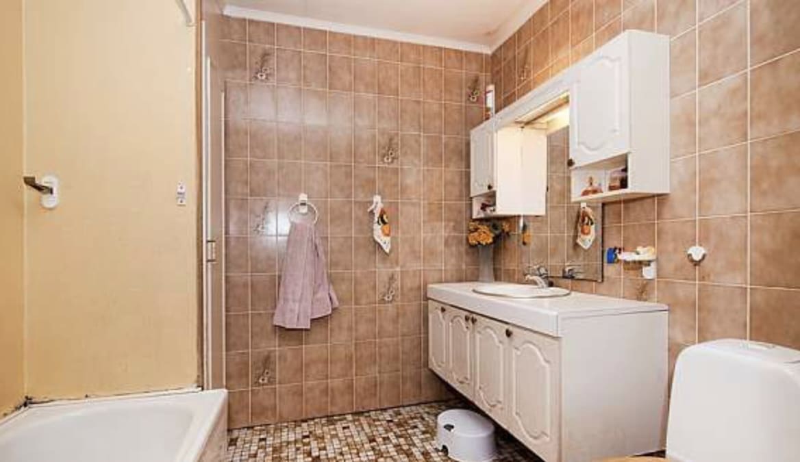 Badrummet från 70-talet behövde omfattande renovering. Alla väggar revs och golvet bröts upp så att all rör och el vart bytt till nytt. Det var bra takhöjd i rummet så taket sänktes för att ge plats åt infällda spotlights med dim-funktion.