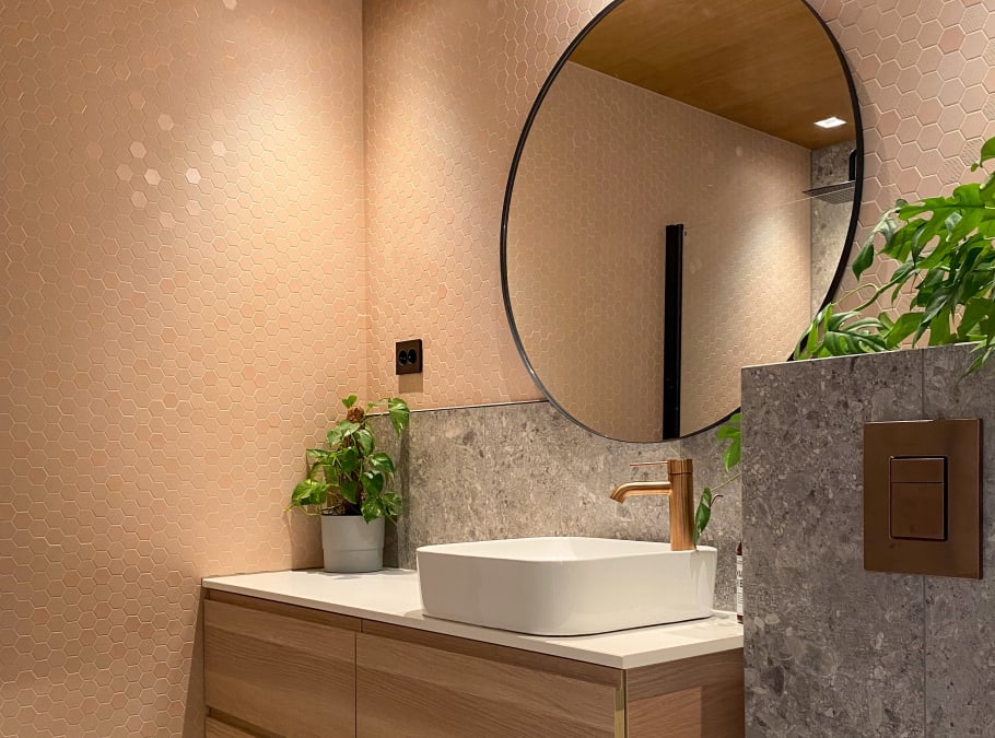 Ekmöblerna är av samma material som taket och pricken över i:et i det här badrummet är blandare och spolplatta i koppar som tar upp färgen från de rosa mosaikplattorna.
